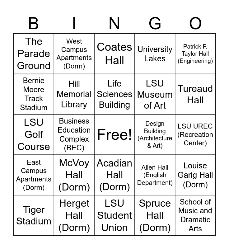 This bingo card has a free space and 57 words: Memorial Tower (Campanile), Tiger Stadium, Mike the Tiger’s Habitat, The Parade Ground, LSU Student Union, Middleton Library, Hill Memorial Library, LSU Museum of Natural Science, LSU Museum of Art, LSU Rural Life Museum, University Lakes, Indian Mounds, LSU AgCenter Botanic Gardens, Highland Road Park Observatory, Center for Computation & Technology, LSU Barnes & Noble Bookstore, Patrick F. Taylor Hall (Engineering), Business Education Complex (BEC), Manship School of Mass Communication, School of Music and Dramatic Arts, Design Building (Architecture & Art), French House (Honors College), Allen Hall (English Department), Coates Hall, Choppin Hall (Chemistry), Life Sciences Building, Nicholson Hall, Himes Hall, Tureaud Hall, Huey P. Long Field House, LSU Gym Armory, LSU Natatorium (Swimming), Pete Maravich Assembly Center (PMAC), LSU Tennis Complex, LSU UREC (Recreation Center), Bernie Moore Track Stadium, Alex Box Stadium (Baseball), LSU Golf Course, Nicholson Gateway Apartments (Dorm), East Campus Apartments (Dorm), West Campus Apartments (Dorm), Acadian Hall (Dorm), Cypress Hall (Dorm), Azalea Hall (Dorm), Camellia Hall (Dorm), Blake Hall (Dorm), McVoy Hall (Dorm), Herget Hall (Dorm), Miller Hall (Dorm), West Laville Hall (Dorm), East Laville Hall (Dorm), Spruce Hall (Dorm), Cedar Hall (Dorm), Annie Boyd Hall (Dorm), Highland Hall (Dorm), Louise Garig Hall (Dorm) and Evangeline Hall (Dorm).