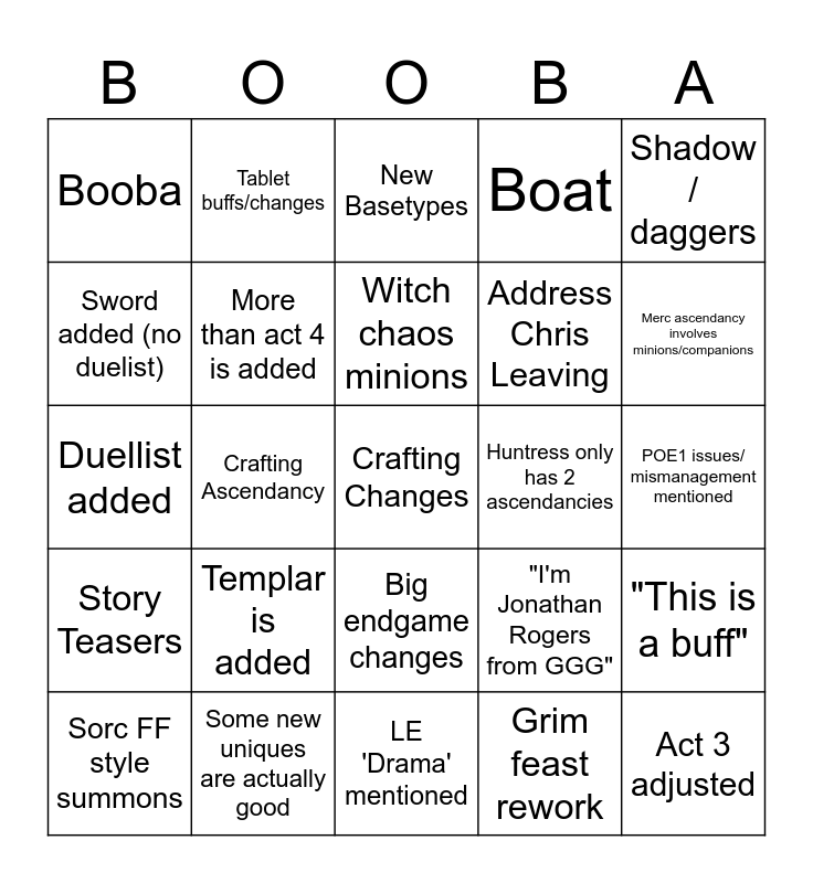 This bingo card has 25 words: Templar is added, LE 'Drama' mentioned, Witch chaos minions, Sorc FF style summons, Shadow / daggers, Booba, Sword added (no duelist), Tablet buffs/changes, Huntress only has 2 ascendancies, Big endgame changes, Address Chris Leaving, Duellist added, "I'm Jonathan Rogers from GGG", "This is a buff", More than act 4 is added, Act 3 adjusted, POE1 issues/ mismanagement mentioned, New Basetypes, Merc ascendancy involves minions/companions, Crafting Ascendancy, Crafting Changes, Some new uniques are actually good, Story Teasers, Boat and Grim feast rework.