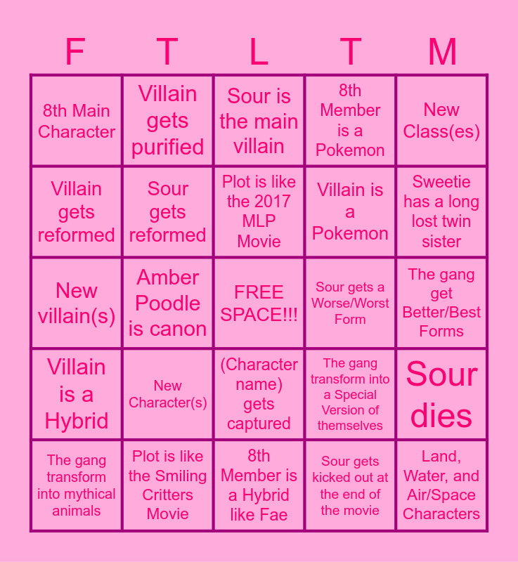 This bingo card has a free space and 24 words: New Character(s), Plot is like the Smiling Critters Movie, Plot is like the 2017 MLP Movie, The gang transform into mythical animals, New Class(es), 8th Main Character, Villain gets reformed, Villain gets purified, Sour gets a Worse/Worst Form, (Character name) gets captured, Villain is a Pokemon, New villain(s), The gang transform into a Special Version of themselves, Sour dies, Sour gets reformed, Sour gets kicked out at the end of the movie, The gang get Better/Best Forms, Sour is the main villain, Sweetie has a long lost twin sister, Amber Poodle is canon, Land, Water, and Air/Space Characters, Villain is a Hybrid, 8th Member is a Pokemon and 8th Member is a Hybrid like Fae.
