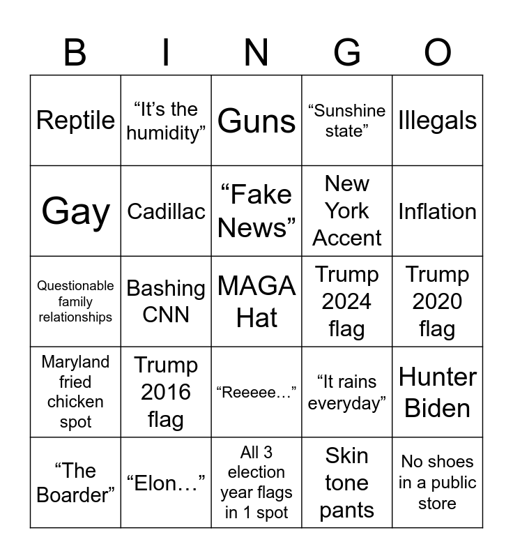 This bingo card has a free space and 24 words: Trump 2016 flag, “Elon…”, “Fake News”, “The Boarder”, Illegals, Reptile, Gay, “It’s the humidity”, Trump 2024 flag, “Reeeee…”, New York Accent, Questionable family relationships, “It rains everyday”, Hunter Biden, Cadillac, Skin tone pants, Trump 2020 flag, Guns, Inflation, Bashing CNN, No shoes in a public store, Maryland fried chicken spot, “Sunshine state” and All 3 election year flags in 1 spot.