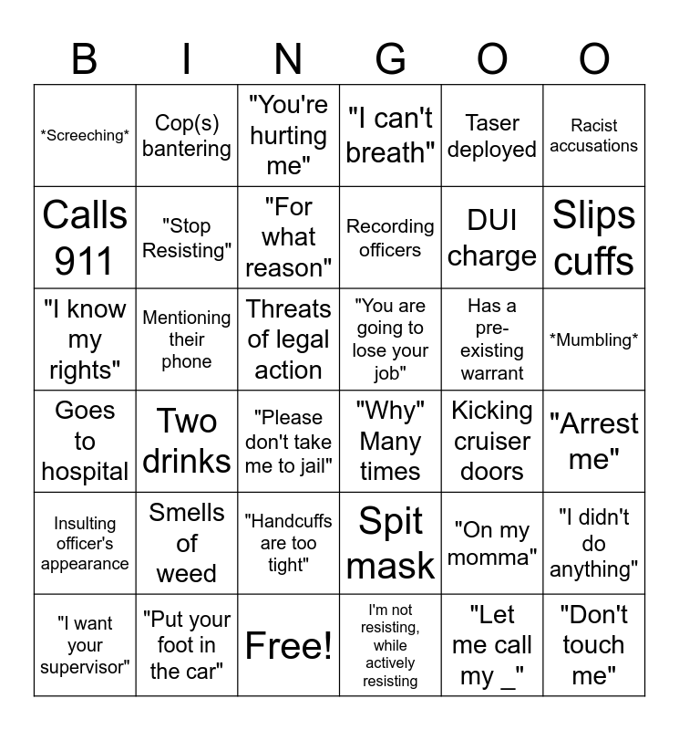 This bingo card has 39 words: "Put your foot in the car", "I want your supervisor", "Name and badge number", Calls 911, "Please don't take me to jail", *Mumbling*, "Stop Resisting", "Don't touch me", Taser deployed, "You are going to lose your job", Slips cuffs, "I can't breath", "I know my rights", Threats of legal action, Mentioning their phone, Has a pre-existing warrant, "On my momma", *Screeching*, Free!, Goes to hospital, Racist accusations, Kicking cruiser doors, "For what reason", Recording officers, I'm not resisting, while actively resisting, "Handcuffs are too tight", Insulting officer's appearance, "Let me call my _", Smells of weed, Cop(s) bantering, "HELP", "I didn't do anything", "You're hurting me", "Why" Many times, "Arrest me", Spit mask, Two drinks, DUI charge and "I need to pee".