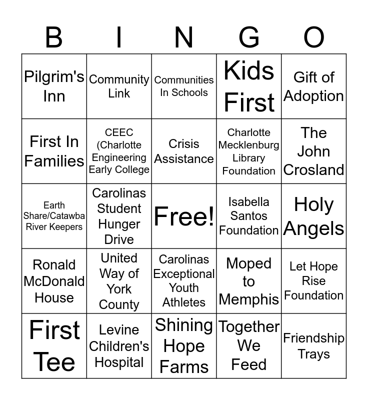 This bingo card has a free space and 33 words: Boys & Girls Club/Salvation Army, Arts & Science Council, Carolinas Student Hunger Drive, Bright Side Youth Ranch, Ronald McDonald House, CEEC (Charlotte Engineering Early College, Gift of Adoption, First Tee, Community Link, Earth Kids, Crisis Assistance, Communities In Schools, United Way Central Carolinas, Charlotte Bridge Home, Isabella Santos Foundation, The John Crosland, Levine Children's Hospital, Earth Share/Catawba River Keepers, United Way of York County, Moped to Memphis, Carolinas Exceptional Youth Athletes, Habitat Charlotte, Pilgrim's Inn, Holy Angels, Shining Hope Farms, Friendship Trays, Kids First, Charlotte Mecklenburg Library Foundation, First In Families, Let Hope Rise Foundation, Cart Fund, Together We Feed and TutorMate.