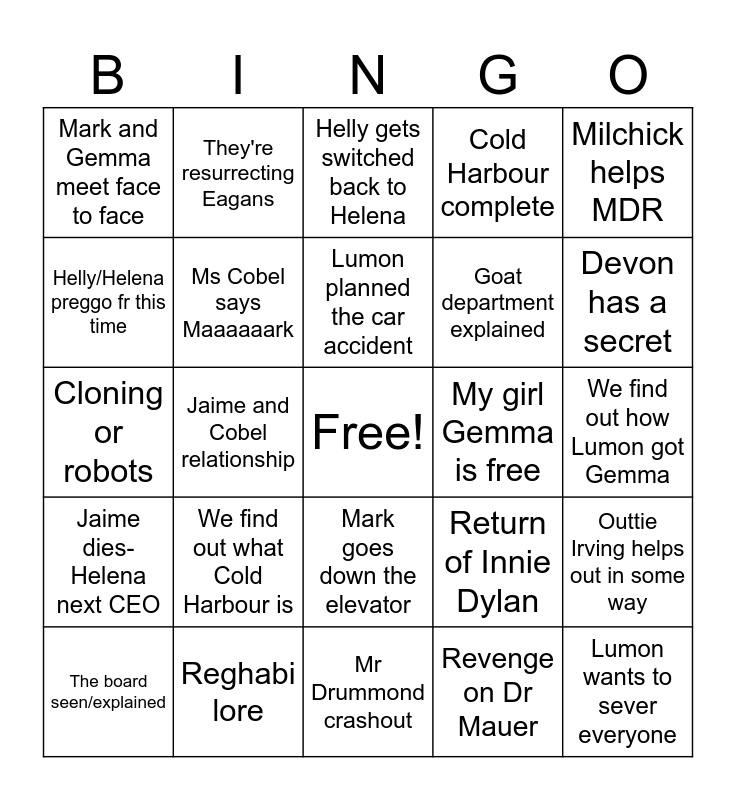 This bingo card has a free space and 24 words: We find out what Cold Harbour is, Reghabi lore, Lumon planned the car accident, The board seen/explained, Milchick helps MDR, Mark and Gemma meet face to face, Helly/Helena preggo fr this time, They're resurrecting Eagans, My girl Gemma is free, Mark goes down the elevator, Goat department explained, Cloning or robots, Return of Innie Dylan, Outtie Irving helps out in some way, Ms Cobel says Maaaaaark, Revenge on Dr Mauer, We find out how Lumon got Gemma, Helly gets switched back to Helena, Devon has a secret, Jaime and Cobel relationship, Lumon wants to sever everyone, Jaime dies- Helena next CEO, Cold Harbour complete and Mr Drummond crashout.