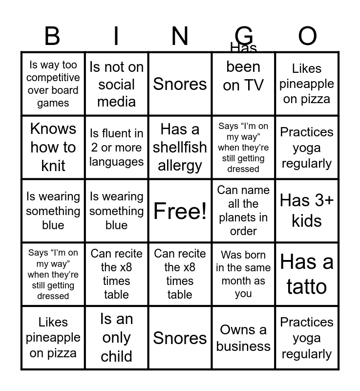 This bingo card has a free space and 50 words: Has traveled to more than 7 countries, Practices yoga regularly, Has a hidden talent, Snores, Can recite the x8 times table, Has run a full marathon (26.2 mi), Is not on social media, Has visited Europe, Knows how to knit, Is an only child, Is fluent in 2 or more languages, Has been on TV, Has a tatto, Was born in the same month as you, Has 3+ kids, Is left-handed, Has a shellfish allergy, Can name all the planets in order, Has a celebrity doppelganger, Likes pineapple on pizza, Is wearing something blue, Owns a business, Is way too competitive over board games, Says “I’m on my way” when they’re still getting dressed, Has beef with a celebrity who doesn’t know they exist, Has traveled to more than seven countries, Practices yoga regularly, Has a hidden talent, Snores, Can recite the x8 times table, Has run a full marathon (26.2 mi), Is not on social media, Has visited Europe, Knows how to knit, Is an only child, Has a tattoo, Has been on TV, Is fluent in 2 or more languages, Was born in the same month as you, Has 3+ kids, Is left-handed, Is allergic to shellfish, Can name all the planets in order, Has a celebrity doppelganger, Likes pineapple on pizza, Is wearing something blue, Owns a business, Is way too competitive over board games, Says “I’m on my way” when they’re still getting dressed and Has beef with a celebrity who doesn’t know they exist.