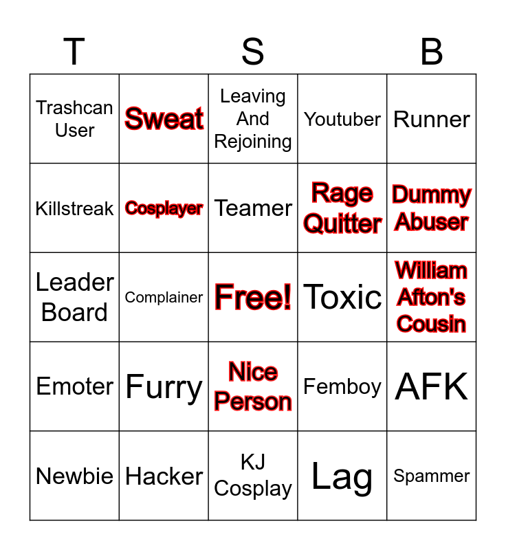 This bingo card has a free space and 24 words: Furry, Hacker, Teamer, Newbie, Runner, Trashcan User, Killstreak, Sweat, Toxic, Nice Person, Rage Quitter, Leader Board, Femboy, AFK, Cosplayer, Lag, William Afton's Cousin, Leaving And Rejoining, Dummy Abuser, Complainer, Spammer, Emoter, Youtuber and KJ Cosplay.