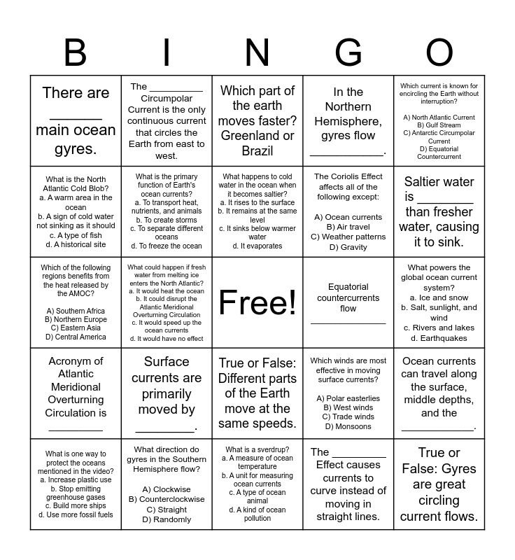 This bingo card has a free space and 24 words: Surface currents are primarily moved by ________., What direction do gyres in the Southern Hemisphere flow? A) Clockwise B) Counterclockwise C) Straight D) Randomly, What happens to cold water in the ocean when it becomes saltier? a. It rises to the surface b. It remains at the same level c. It sinks below warmer water d. It evaporates, What is one way to protect the oceans mentioned in the video? a. Increase plastic use b. Stop emitting greenhouse gases c. Build more ships d. Use more fossil fuels, Which current is known for encircling the Earth without interruption? A) North Atlantic Current B) Gulf Stream C) Antarctic Circumpolar Current D) Equatorial Countercurrent, There are ______ main ocean gyres., What is the North Atlantic Cold Blob? a. A warm area in the ocean b. A sign of cold water not sinking as it should c. A type of fish d. A historical site, The __________ Circumpolar Current is the only continuous current that circles the Earth from east to west., Equatorial countercurrents flow _______________, True or False: Different parts of the Earth move at the same speeds., The Coriolis Effect affects all of the following except: A) Ocean currents B) Air travel C) Weather patterns D) Gravity, Which of the following regions benefits from the heat released by the AMOC? A) Southern Africa B) Northern Europe C) Eastern Asia D) Central America, Which winds are most effective in moving surface currents? A) Polar easterlies B) West winds C) Trade winds D) Monsoons, Ocean currents can travel along the surface, middle depths, and the ____________., What is the primary function of Earth's ocean currents? a. To transport heat, nutrients, and animals b. To create storms c. To separate different oceans d. To freeze the ocean, The _________ Effect causes currents to curve instead of moving in straight lines., What powers the global ocean current system? a. Ice and snow b. Salt, sunlight, and wind c. Rivers and lakes d. Earthquakes, Which part of the earth moves faster? Greenland or Brazil, Saltier water is ________ than fresher water, causing it to sink., What could happen if fresh water from melting ice enters the North Atlantic? a. It would heat the ocean b. It could disrupt the Atlantic Meridional Overturning Circulation c. It would speed up the ocean currents d. It would have no effect, True or False: Gyres are great circling current flows., Acronym of Atlantic Meridional Overturning Circulation is _________, In the Northern Hemisphere, gyres flow ___________. and What is a sverdrup? a. A measure of ocean temperature b. A unit for measuring ocean currents c. A type of ocean animal d. A kind of ocean pollution.