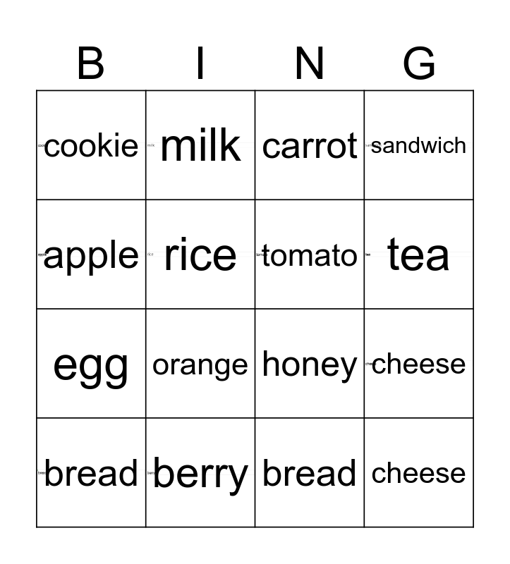 This bingo card has 12 images and 21 words: berry, orange, milk, apple, bread, tomato, cookie, carrot, honey, tea, egg, sandwich, cheese, salad, rice, juice, bread, orange, apple, cheese and burger.