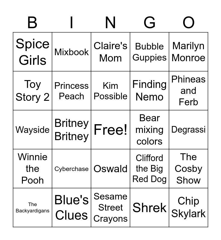 This bingo card has a free space and 120 words: Homestar Runner, Nickelodeon, The Great Muppet Caper, The Muppet Show, Hi-5, The Fairly OddParents, Bubble Guppies, Destiny's Child, The Cosby Show, Pappy, Big Time Rush, Scooby-Doo, Community, The Simpsons, The Loud House, Peanuts, Oswald, Rolie Polie Olie compared to Pingu, Doc McStuffins, The Muppets, The Backyardigans, Claire's Mom, Seinfeld, Herry Monster, Nelvana, Winnie the Pooh, Blue's Clues, The origins of Telly Monster, Maggie and the Ferocious Beast, Between the Lions, Shrek, Britney Britney, Kim Possible, Jimmy Neutron, The Muppets Take Manhattan, JC Chasez and Ally, Chris Pine, Bee Movie, The Proud Family, Foghorn Leghorn, Danny Phantom, The Fairy Godperson, The Middle, Muppets from Space, Cosmo and Wanda, The Big Bang Theory, Dr. Seuss, Bear mixing colors, Friends, My Little Pony: Friendship is Magic, Hamilton misplaces his H, Foster's Home for Imaginary Friends, Clifford the Big Red Dog, Fraggle Rock, Printer cartridges, Sony Pictures Entertainment, Pepe, Sesame Street, Billy Joel, Mixbook, Sofia the First, Dora the Explorer, Barney, PBS Kids, Chuck E. Cheese, Toy Story 2, Kids' Favorite Songs, Jeff Dunham, Debbie Reynolds, Muppet Treasure Island, Wayside, Monsters, Inc., Family Matters, Jake and the Never Land Pirates, Shirley Grey, Tad and Chad, Finding Nemo, Cindy Vortex, Chip Skylark, Cyberchase, Spice Girls, Avenue Q, Kate and Car Boy, The Pointer Sisters, Stephanie and Sportacus, Sesame Street humans, Sesame Street Crayons, Modern Family, Frankie, SpongeBob SquarePants, Pepe the King Prawn, Degrassi, NSYNC, The Muppets' Wizard of Oz, Kermit the Frog (optional: Kermit on Sesame Street), Diana Ross and the Supremes, The Mr. Men Show, Marilyn Monroe, Looney Tunes, Disney Princess, Mr. Knack, Fred and Daphne, Bear in the Big Blue House, The Angry Beavers, Artistic Cakes, Princess Peach, Garfield, Sofia the First, The Muppets' Wizard of Oz, Timmy Turner, Rio, The Electric Mayhem, Norm the Genie, Nick and Jessica, Phineas and Ferb, Grover, Batly, Big Bird and Snuffy, My crying baby fetish and Kendall.