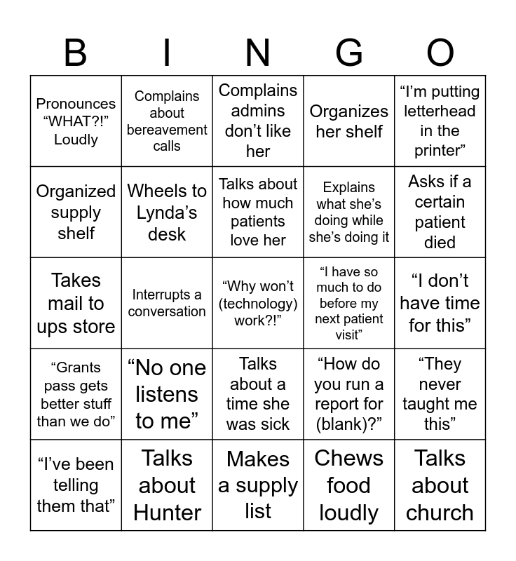This bingo card has a free space and 24 words: “I’ve been telling them that”, “No one listens to me”, Talks about how much patients love her, Chews food loudly, “I’m putting letterhead in the printer”, Pronounces “WHAT?!” Loudly, Complains about bereavement calls, Complains admins don’t like her, “I have so much to do before my next patient visit”, “I don’t have time for this”, Takes mail to ups store, Wheels to Lynda’s desk, “How do you run a report for (blank)?”, “They never taught me this”, Organized supply shelf, Talks about Hunter, Makes a supply list, Organizes her shelf, Asks if a certain patient died, “Grants pass gets better stuff than we do”, Interrupts a conversation, Talks about a time she was sick, Explains what she’s doing while she’s doing it and Talks about church.