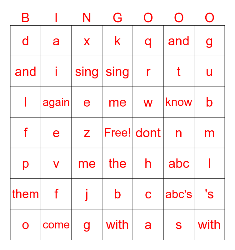 This bingo card has a free space and 55 words: a, b, c, d, e, f, g, h, i, j, k, l, m, n, o, p, q, r, s, t, u, v, w, x, y, and, z, now, I, know, my, abc, 's, come, and, sing, them, again, with, me, a, b, c, d, e, f, g, h, dont, sing, the, abc's, with, me and reeeeeeeeeeee.