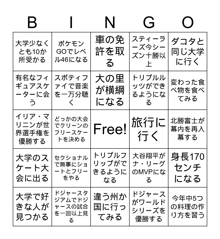 This bingo card has a free space and 24 words: セクショナルで無事にショートとフリーをやる, ドジャースタジアムでドジャースの試合を一回以上見る, 大の里が横綱になる, 大学で好きな人が見つかる, ダコタと同じ大学に行く, 大学少なくとも10か所受かる, 有名なフィギュアスケーターに会う, ポケモンGOでレベル46になる, 旅行に行く, トリプルフリップができるようになる, トリプルルッツができるようになる, イリア・マリニンが世界選手権を優勝する, 大谷翔平がナ・リーグのMVPになる, 身長170センチになる, スポティファイで音楽を一万分聴く, ドジャースがワールドシリーズを優勝する, 北勝富士が幕内を再入幕する, 車の免許を取る, 変わった食べ物を食べてみる, どっかの大会でクリーンのフリースケートを決める, 今年中5つの料理の作り方を習う, 大学のスケート大会に出る, スティーラーズ今シーズン十勝以上 and 違う州か国に行ってみる.