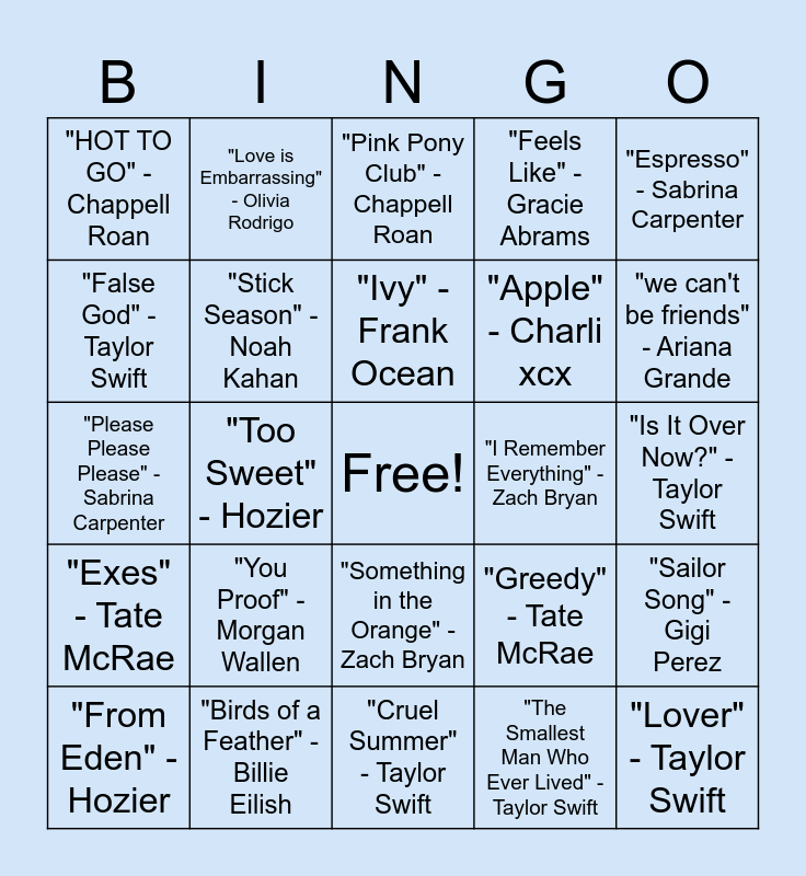 This bingo card has a free space and 30 words: "Birds of a Feather" - Billie Eilish, "Close to You" - Gracie Abrams, "Too Sweet" - Hozier, "Good Luck Babe" - Chappell Roan, "HOT TO GO" - Chappell Roan, "Pink Pony Club" - Chappell Roan, "Stick Season" - Noah Kahan, "Something in the Orange" - Zach Bryan, "I Remember Everything" - Zach Bryan, "Cruel Summer" - Taylor Swift, "Is It Over Now?" - Taylor Swift, "Lover" - Taylor Swift, "The Smallest Man Who Ever Lived" - Taylor Swift, "FEIN" - Travis Scott & Playboi Carti, "we can't be friends" - Ariana Grande, "Saturn" - SZA, "Greedy" - Tate McRae, "Exes" - Tate McRae, "You Proof" - Morgan Wallen, "Espresso" - Sabrina Carpenter, "Please Please Please" - Sabrina Carpenter, "Vampire" - Olivia Rodrigo, "Love is Embarrassing" - Olivia Rodrigo, "Apple" - Charli xcx, "False God" - Taylor Swift, "Feels Like" - Gracie Abrams, "Sailor Song" - Gigi Perez, "From Eden" - Hozier, "Ivy" - Frank Ocean and "Abracadabra" - Lady Gaga.