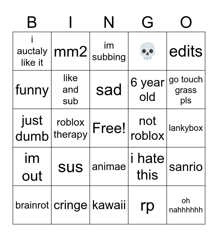 This bingo card has a free space and 24 words: sus, cringe, sad, brainrot, edits, i auctaly like it, funny, mm2, not roblox, animae, 6 year old, just dumb, i hate this, sanrio, like and sub, rp, lankybox, im subbing, go touch grass pls, roblox therapy, oh nahhhhhh, im out, 💀 and kawaii.