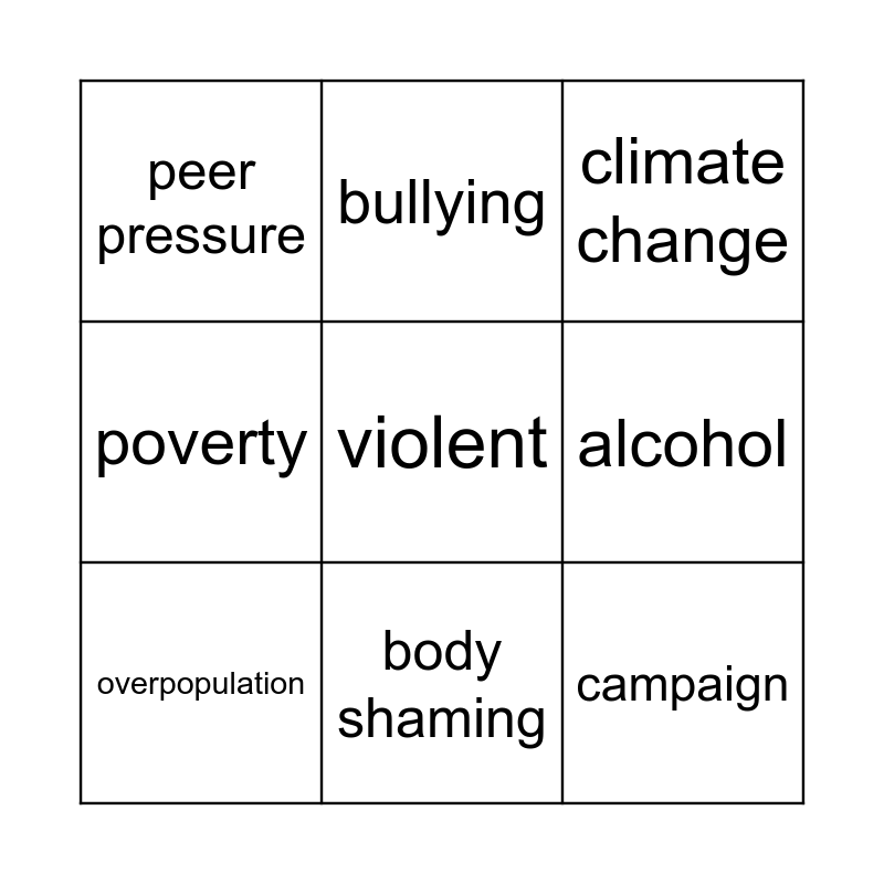 This bingo card has a free space and 8 words: alcohol, climate change, bullying, overpopulation, peer pressure, campaign, poverty and body shaming.