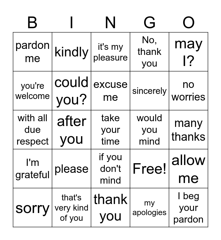 This bingo card has 25 words: please, thank you, excuse me, sorry, may I?, pardon me, you're welcome, kindly, would you mind, if you don't mind, sincerely, with all due respect, Free!, allow me, could you?, I beg your pardon, many thanks, it's my pleasure, no worries, after you, take your time, that's very kind of you, I'm grateful, No, thank you and my apologies.