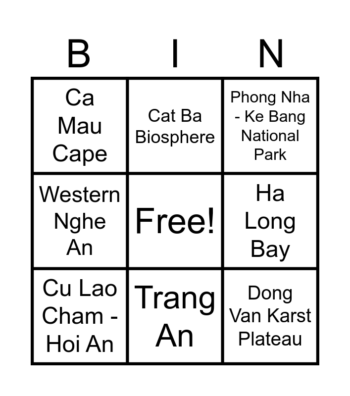 This bingo card has a free space and 8 words: Ha Long Bay, Phong Nha - Ke Bang National Park, Cat Ba Biosphere, Cu Lao Cham - Hoi An, Ca Mau Cape, Dong Van Karst Plateau, Western Nghe An and Trang An.