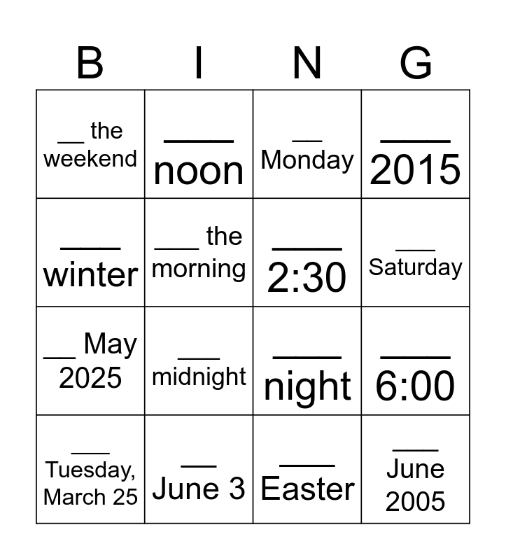 This bingo card has 16 words: __ June 3, ___ 6:00, __ Monday, __ the weekend, __ May 2025, ___ noon, ___ night, ___ Easter, ___ winter, ___ the morning, ___ Tuesday, March 25, ___ 2015, ___ midnight, ___ Saturday, ___ 2:30 and ___ June 2005.