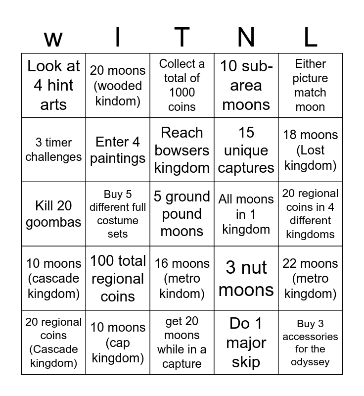 This bingo card has a free space and 24 words: 100 total regional coins, 10 moons (cap kingdom), Reach bowsers kingdom, 20 regional coins (Cascade kingdom), Either picture match moon, Look at 4 hint arts, 3 timer challenges, 20 moons (wooded kindom), All moons in 1 kingdom, 16 moons (metro kindom), 15 unique captures, Kill 20 goombas, 3 nut moons, 22 moons (metro kingdom), Enter 4 paintings, Do 1 major skip, 20 regional coins in 4 different kingdoms, Collect a total of 1000 coins, 18 moons (Lost kingdom), Buy 5 different full costume sets, Buy 3 accessories for the odyssey, 10 moons (cascade kingdom), 10 sub-area moons and get 20 moons while in a capture.