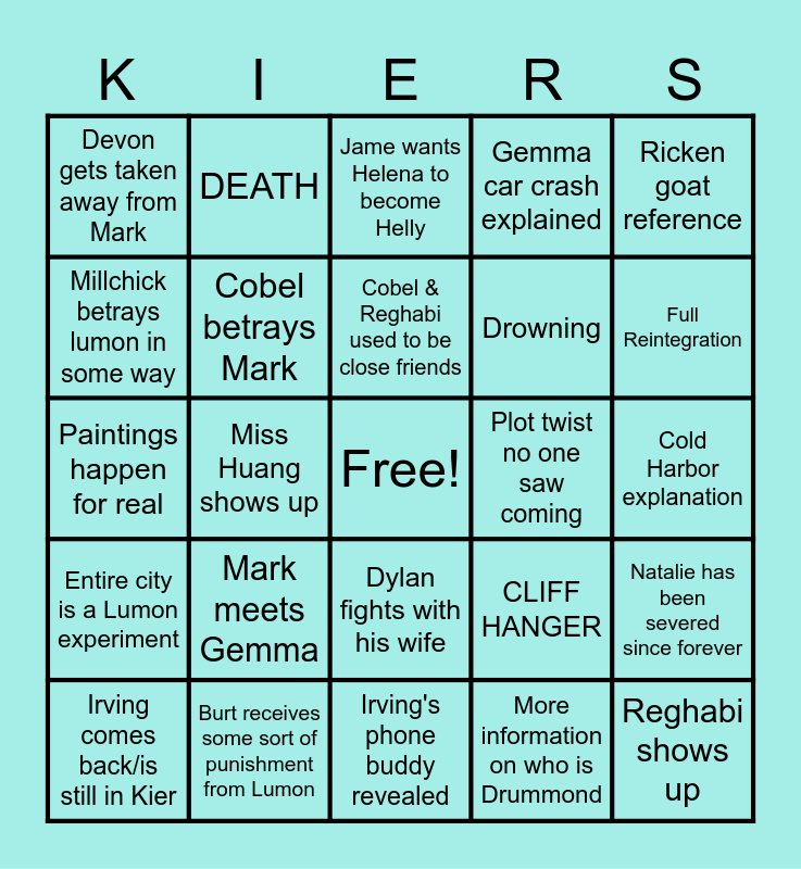 This bingo card has a free space and 24 words: Mark meets Gemma, Burt receives some sort of punishment from Lumon, Cobel & Reghabi used to be close friends, Irving comes back/is still in Kier, Ricken goat reference, Devon gets taken away from Mark, Millchick betrays lumon in some way, DEATH, Plot twist no one saw coming, Dylan fights with his wife, Drowning, Paintings happen for real, CLIFF HANGER, Natalie has been severed since forever, Cobel betrays Mark, More information on who is Drummond, Cold Harbor explanation, Jame wants Helena to become Helly, Full Reintegration, Miss Huang shows up, Reghabi shows up, Entire city is a Lumon experiment, Gemma car crash explained and Irving's phone buddy revealed.