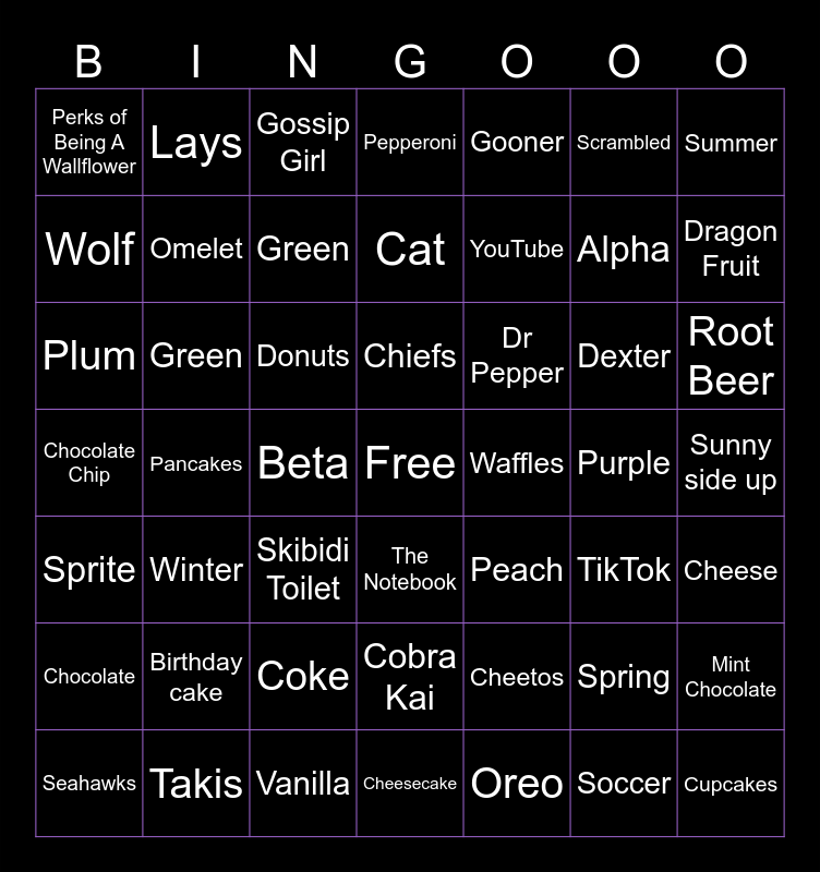 This bingo card has a free space and 48 words: Sprite, Pancakes, Vanilla, The Notebook, YouTube, Purple, Summer, Seahawks, Green, Beta, Pepperoni, Gooner, Dexter, Root Beer, Chocolate Chip, Birthday cake, Gossip Girl, Chiefs, Cheetos, Scrambled, Dragon Fruit, Wolf, Lays, Green, Oreo, Alpha, Sunny side up, Chocolate, Winter, Donuts, Cobra Kai, Dr Pepper, Spring, Mint Chocolate, Perks of Being A Wallflower, Takis, Skibidi Toilet, Cheesecake, Waffles, Soccer, Cheese, Plum, Omelet, Coke, Cat, Peach, TikTok and Cupcakes.
