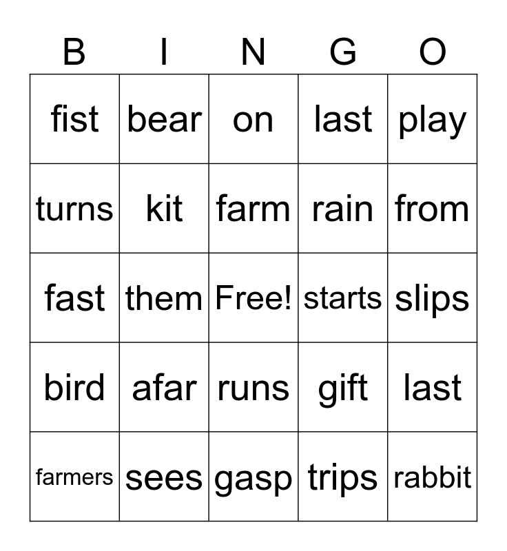 This bingo card has a free space and 24 words: afar, sees, farm, farmers, play, fist, turns, bear, starts, runs, rain, fast, gift, last, kit, trips, slips, on, from, them, rabbit, bird, last and gasp.