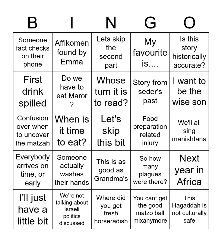 This bingo card has a free space and 24 words: Someone actually washes their hands, We're not talking about Israeli politics discussed, Whose turn it is to read?, I'll just have a little bit, Is this story historically accurate?, Someone fact checks on their phone, First drink spilled, Affikomen found by Emma, Food preparation related injury, This is as good as Grandma's, Story from seder's past, Confusion over when to uncover the matzah, So how many plagues were there?, Next year in Africa, Do we have to eat Maror ?, You cant get the good matzo ball mixanymore, We'll all sing manishtana, Lets skip the second part, I want to be the wise son, When is it time to eat?, This Hagaddah is not culturally safe, Everybody arrives on time, or early, My favourite is.... and Where did you get fresh horseradish.