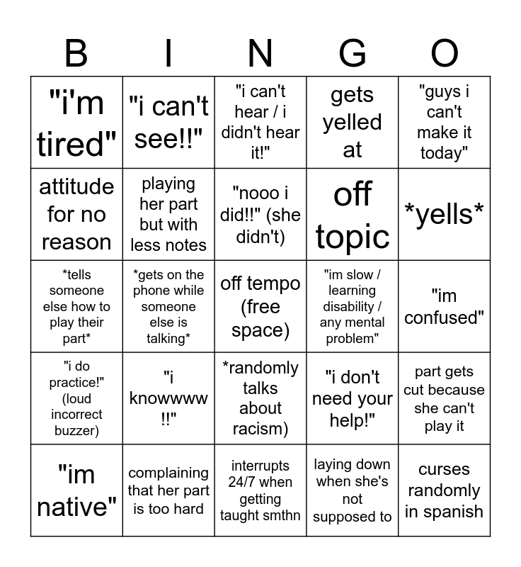This bingo card has a free space and 24 words: "im native", "i knowwww !!", "nooo i did!!" (she didn't), laying down when she's not supposed to, "guys i can't make it today", "i'm tired", "i can't see!!", "i can't hear / i didn't hear it!", "im slow / learning disability / any mental problem", "im confused", *tells someone else how to play their part*, playing her part but with less notes, "i don't need your help!", part gets cut because she can't play it, attitude for no reason, complaining that her part is too hard, interrupts 24/7 when getting taught smthn, gets yelled at, *yells*, "i do practice!" (loud incorrect buzzer), *gets on the phone while someone else is talking*, *randomly talks about racism), off topic and curses randomly in spanish.