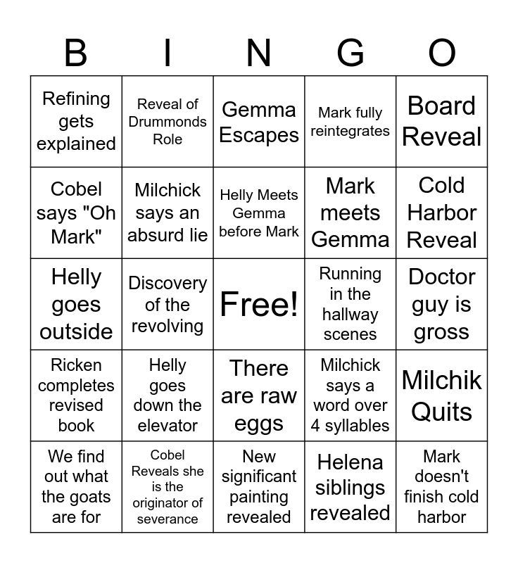 This bingo card has a free space and 24 words: Helly goes down the elevator, Cobel Reveals she is the originator of severance, Helly Meets Gemma before Mark, We find out what the goats are for, Board Reveal, Refining gets explained, Cobel says "Oh Mark", Reveal of Drummonds Role, Running in the hallway scenes, There are raw eggs, Mark meets Gemma, Helly goes outside, Milchick says a word over 4 syllables, Milchik Quits, Milchick says an absurd lie, Helena siblings revealed, Doctor guy is gross, Gemma Escapes, Cold Harbor Reveal, Discovery of the revolving, Mark doesn't finish cold harbor, Ricken completes revised book, Mark fully reintegrates and New significant painting revealed.