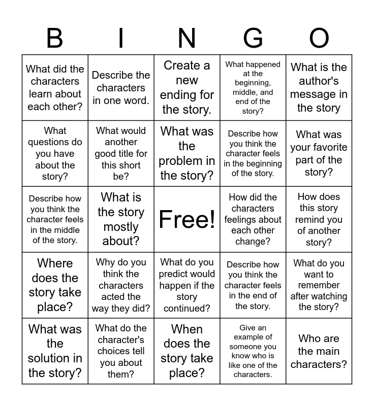 This bingo card has a free space and 24 words: Why do you think the characters acted the way they did?, What do the character's choices tell you about them?, What was the problem in the story?, What was the solution in the story?, What is the author's message in the story, What did the characters learn about each other?, What questions do you have about the story?, Describe the characters in one word., How did the characters feelings about each other change?, What do you predict would happen if the story continued?, Describe how you think the character feels in the beginning of the story., Describe how you think the character feels in the middle of the story., Describe how you think the character feels in the end of the story., What do you want to remember after watching the story?, What would another good title for this short be?, Give an example of someone you know who is like one of the characters., How does this story remind you of another story?, Create a new ending for the story., What was your favorite part of the story?, What is the story mostly about?, Who are the main characters?, Where does the story take place?, What happened at the beginning, middle, and end of the story? and When does the story take place?.