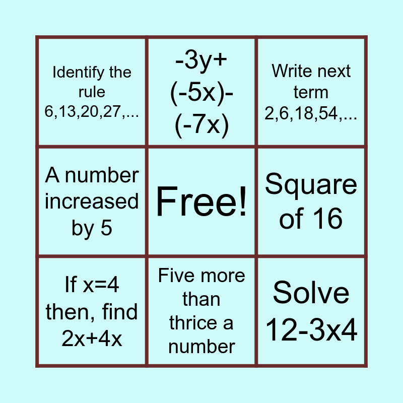 This bingo card has a free space and 9 words: If x=4 then, find 2x+4x, -3y+(-5x)-(-7x), Square of 16, Identify the rule 6,13,20,27,..., Write next term 2,6,18,54,..., A number increased by 5, Five more than thrice a number, Solve 12-3x4 and 5x-6, Is 5 a constant?.