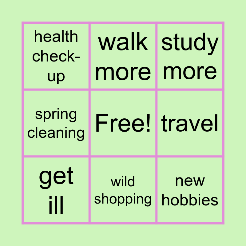 This bingo card has a free space and 8 words: travel, study more, walk more, get ill, health check-up, new hobbies, spring cleaning and wild shopping.