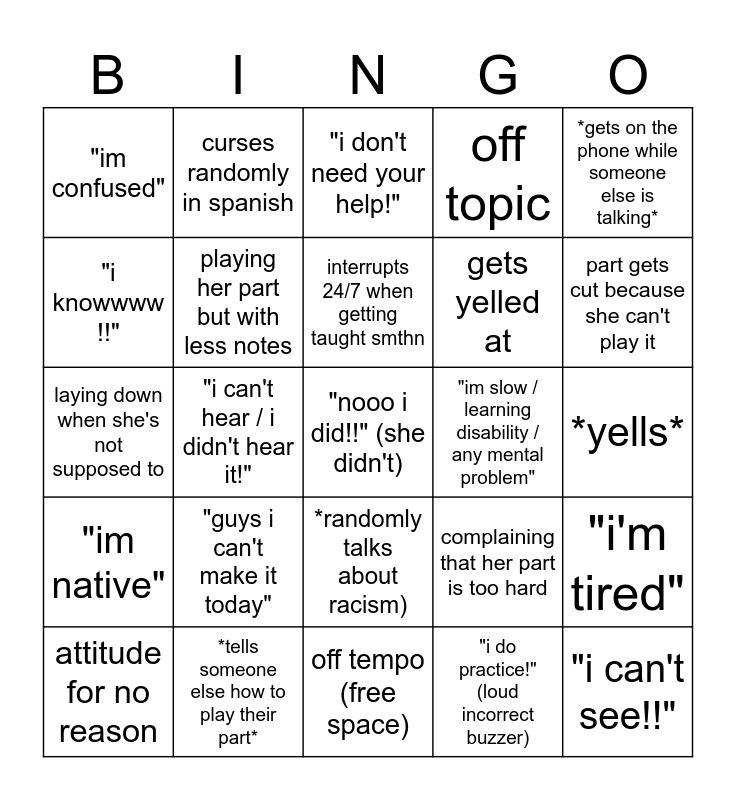 This bingo card has 25 words: "im native", *tells someone else how to play their part*, "nooo i did!!" (she didn't), "i do practice!" (loud incorrect buzzer), *gets on the phone while someone else is talking*, "im confused", curses randomly in spanish, "i don't need your help!", "im slow / learning disability / any mental problem", "i'm tired", "i knowwww !!", playing her part but with less notes, off tempo (free space), complaining that her part is too hard, part gets cut because she can't play it, attitude for no reason, "i can't hear / i didn't hear it!", interrupts 24/7 when getting taught smthn, gets yelled at, *yells*, laying down when she's not supposed to, "guys i can't make it today", *randomly talks about racism), off topic and "i can't see!!".