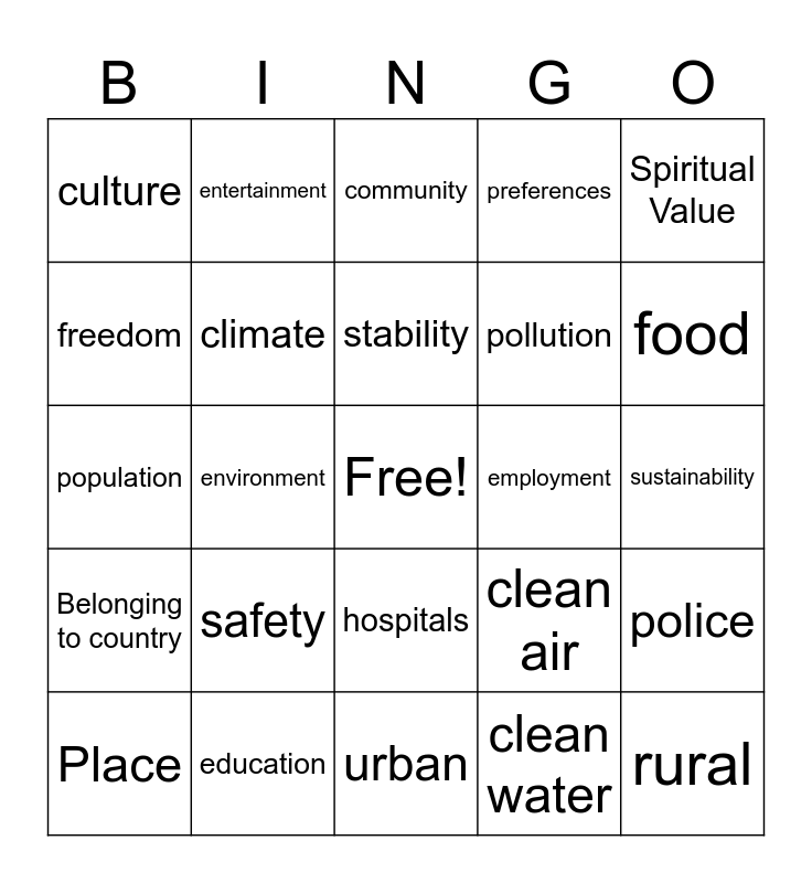 This bingo card has a free space and 29 words: Place, liveability, environment, infrastructure, culture, community, climate, safety, employment, education, sustainability, rural, urban, clean water, food, health, hospitals, Belonging to country, Spiritual Value, population, clean air, Factors, pollution, freedom, preferences, entertainment, police, stability and security.