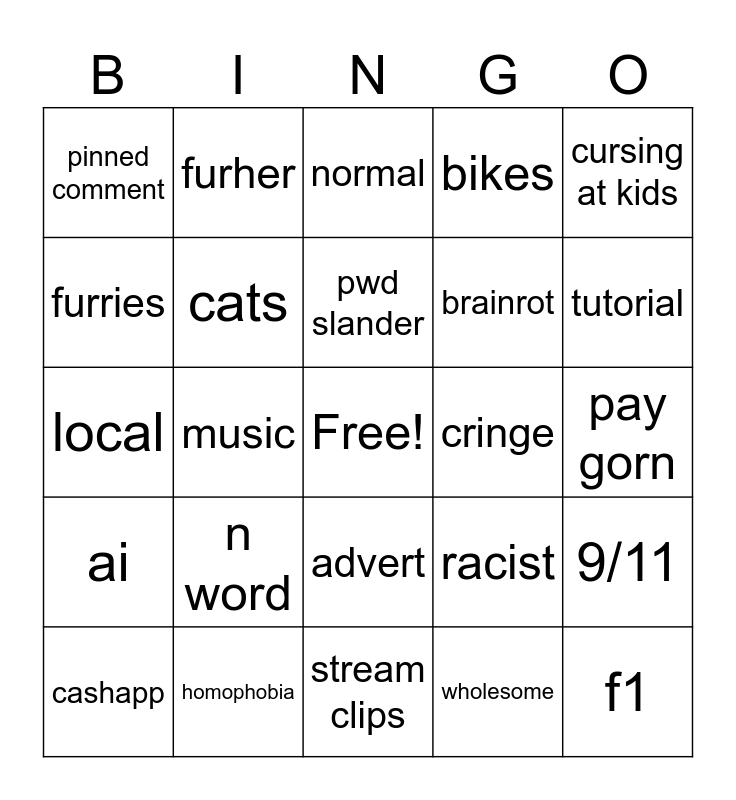 This bingo card has a free space and 24 words: n word, homophobia, pwd slander, cashapp, cursing at kids, pinned comment, furries, furher, cringe, advert, brainrot, local, racist, 9/11, cats, wholesome, pay gorn, normal, tutorial, music, f1, ai, bikes and stream clips.