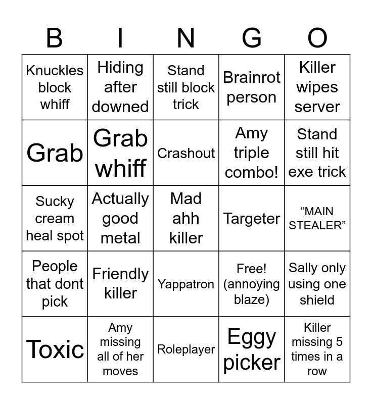 This bingo card has 25 words: Friendly killer, Roleplayer, Crashout, Toxic, Killer wipes server, Knuckles block whiff, Grab, Hiding after downed, Targeter, Yappatron, Amy triple combo!, Sucky cream heal spot, Free!(annoying blaze), Sally only using one shield, Grab whiff, Killer missing 5 times in a row, “MAIN STEALER”, Stand still block trick, Stand still hit exe trick, Actually good metal, Mad ahh killer, Amy missing all of her moves, People that dont pick, Brainrot person and Eggy picker.