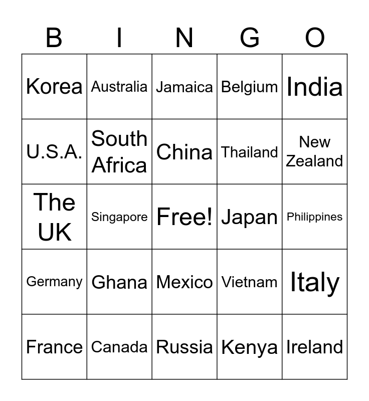 This bingo card has a free space and 24 words: Ghana, Canada, China, France, India, Korea, U.S.A., Australia, Japan, Mexico, Thailand, The UK, Vietnam, Italy, South Africa, Kenya, Philippines, Jamaica, New Zealand, Singapore, Ireland, Germany, Belgium and Russia.