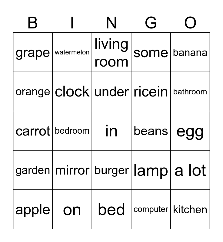 This bingo card has a free space and 24 words: mirror, on, under, apple, banana, grape, orange, watermelon, beans, burger, ricein, carrot, lamp, a lot, clock, computer, egg, living room, bathroom, bedroom, kitchen, garden, some and bed.