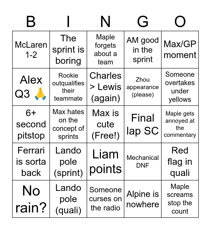This bingo card has a free space and 24 words: Lando pole (sprint), Lando pole (quali), Charles > Lewis (again), No rain?, Max/GP moment, McLaren 1-2, Alex Q3 🙏, The sprint is boring, Final lap SC, Liam points, Zhou appearance (please), 6+ second pitstop, Mechanical DNF, Red flag in quali, Rookie outqualifies their teammate, Alpine is nowhere, Maple gets annoyed at the commentary, Maple forgets about a team, Someone overtakes under yellows, Max hates on the concept of sprints, Maple screams stop the count, Ferrari is sorta back, AM good in the sprint and Someone curses on the radio.