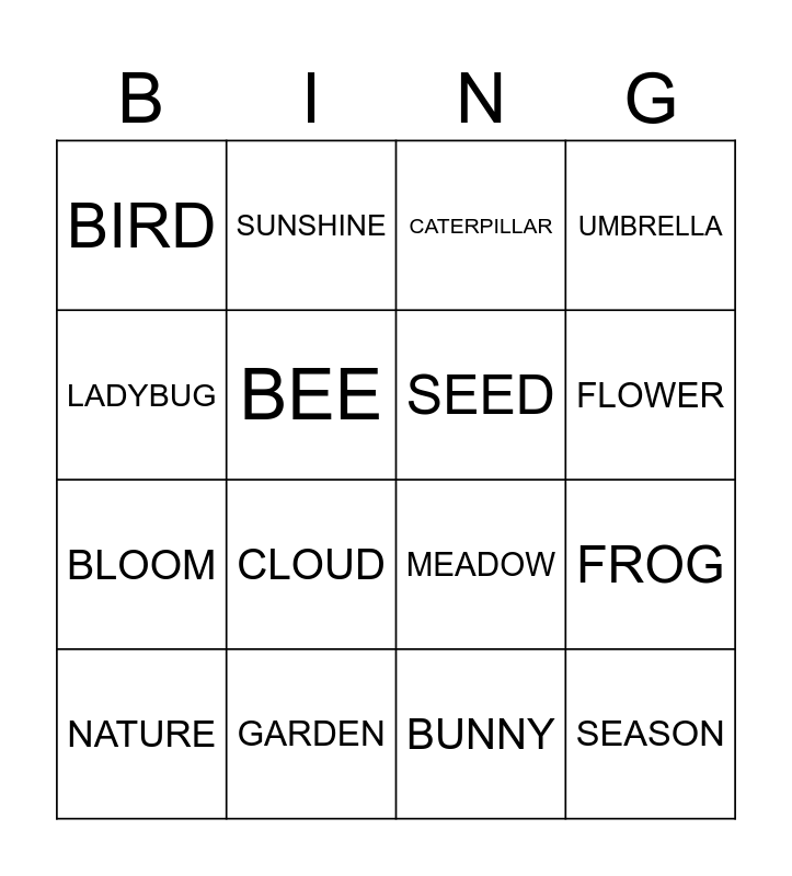 This bingo card has 24 words: RAINBOW, BUTTERFLY, FLOWER, GRASS, LADYBUG, BIRD, BEE, SUNSHINE, GARDEN, GRASSHOPPER, BLOOM, MEADOW, KITE, WARM, SEED, TREE, BUNNY, CATERPILLAR, CLOUD, FROG, NATURE, SEASON, UMBRELLA and EASTER.