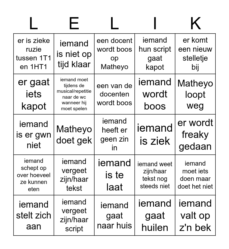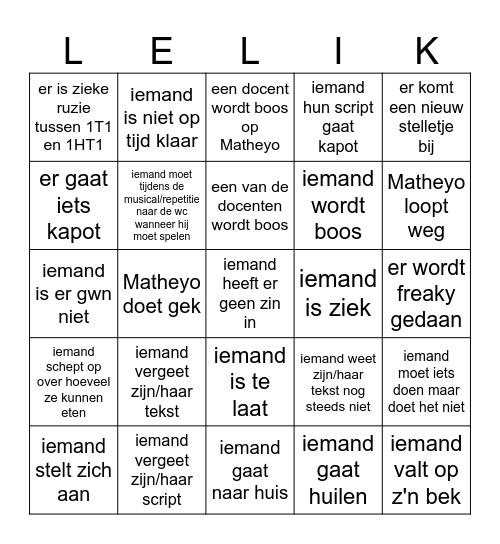 This bingo card has a free space and 24 words: iemand vergeet zijn/haar tekst, iemand vergeet zijn/haar script, een van de docenten wordt boos, iemand stelt zich aan, er komt een nieuw stelletje bij, er is zieke ruzie tussen 1T1 en 1HT1, er gaat iets kapot, iemand is niet op tijd klaar, iemand is ziek, iemand is te laat, iemand wordt boos, iemand is er gwn niet, iemand weet zijn/haar tekst nog steeds niet, iemand moet iets doen maar doet het niet, iemand moet tijdens de musical/repetitie naar de wc wanneer hij moet spelen, iemand gaat huilen, er wordt freaky gedaan, een docent wordt boos op Matheyo, Matheyo loopt weg, Matheyo doet gek, iemand valt op z'n bek, iemand schept op over hoeveel ze kunnen eten, iemand hun script gaat kapot and iemand gaat naar huis.