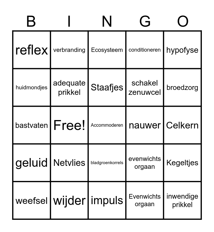 This bingo card has 42 words: Levenskenmerk, Staafjes, Houtvaten, Netvlies, Evenwichts orgaan, Kegeltjes, Accommoderen, Biotische factor, Ecosysteem, bladgroenkorrels, Celkern, broedzorg, Free!, hypofyse, trommelvlies, evenwichts orgaan, slakkenhuis, bastvaten, glucose en zuurstof, verbranding, huidmondjes, territorium gedrag, inwendige prikkel, reflex, grote hersenen, centraal zenuwstelsel, schakel zenuwcel, bewegings zenuwcel, adrenaline, oestrogeen, gevoelszenuwcel, geluid, adequate prikkel, impuls, bouwstoffen, weefsel, wijder, nauwer, protocol, ethogram, conditioneren and wortelharen.