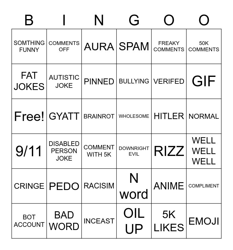 This bingo card has 36 words: N word, RACISIM, OIL UP, FAT JOKES, 9/11, WHOLESOME, AUTISTIC JOKE, INCEAST, FREAKY COMMENTS, ANIME, GIF, SPAM, COMPLIMENT, GYATT, BULLYING, SOMTHING FUNNY, CRINGE, HITLER, Free!, AURA, BRAINROT, DISABLED PERSON JOKE, DOWNRIGHT EVIL, COMMENT WITH 5K, RIZZ, COMMENTS OFF, VERIFED, BAD WORD, PINNED, 50K COMMENTS, EMOJI, BOT ACCOUNT, WELL WELL WELL, NORMAL, PEDO and 5K LIKES.