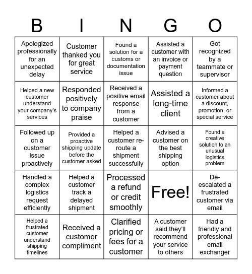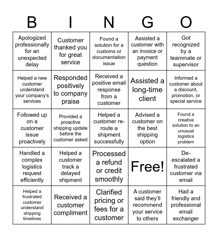 This bingo card has 25 words: Helped a customer track a delayed shipment, Clarified pricing or fees for a customer, Received a positive email response from a customer, Helped a frustrated customer understand shipping timelines, Got recognized by a teammate or supervisor, Apologized professionally for an unexpected delay, Helped a new customer understand your company’s services, Customer thanked you for great service, Advised a customer on the best shipping option, Processed a refund or credit smoothly, Assisted a long-time client, Followed up on a customer issue proactively, Free!, De-escalated a frustrated customer via email, Responded positively to company praise, Had a friendly and professional email exchanger, Found a creative solution to an unusual logistics problem, Found a solution for a customs or documentation issue, Informed a customer about a discount, promotion, or special service, Provided a proactive shipping update before the customer asked, Helped a customer re-route a shipment successfully, Received a customer compliment, Handled a complex logistics request efficiently, Assisted a customer with an invoice or payment question and A customer said they’ll recommend your service to others.