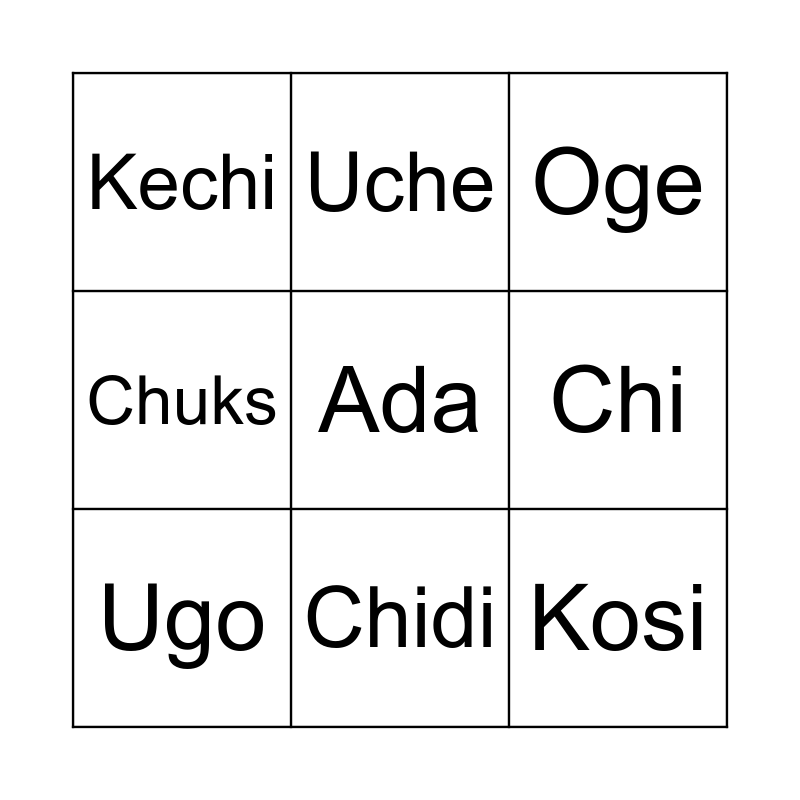 This bingo card has a free space and 8 words: Chi, Oge, Uche, Ugo, Kechi, Kosi, Chuks and Chidi.