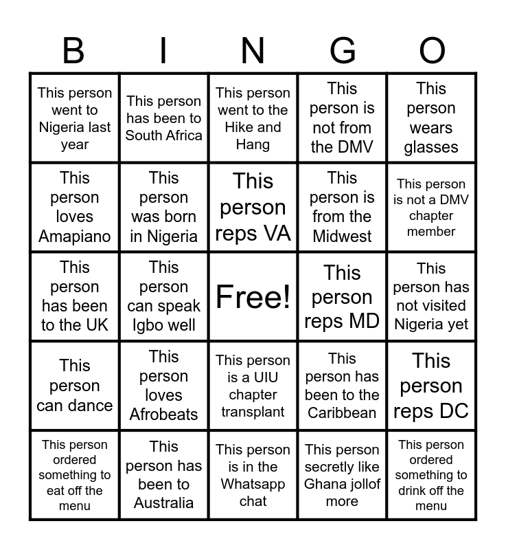 This bingo card has a free space and 24 words: This person loves Afrobeats, This person has been to Australia, This person reps VA, This person ordered something to eat off the menu, This person wears glasses, This person went to Nigeria last year, This person loves Amapiano, This person has been to South Africa, This person reps MD, This person is a UIU chapter transplant, This person is from the Midwest, This person has been to the UK, This person has been to the Caribbean, This person reps DC, This person was born in Nigeria, This person secretly like Ghana jollof more, This person has not visited Nigeria yet, This person went to the Hike and Hang, This person is not a DMV chapter member, This person can speak Igbo well, This person ordered something to drink off the menu, This person can dance, This person is not from the DMV and This person is in the Whatsapp chat.