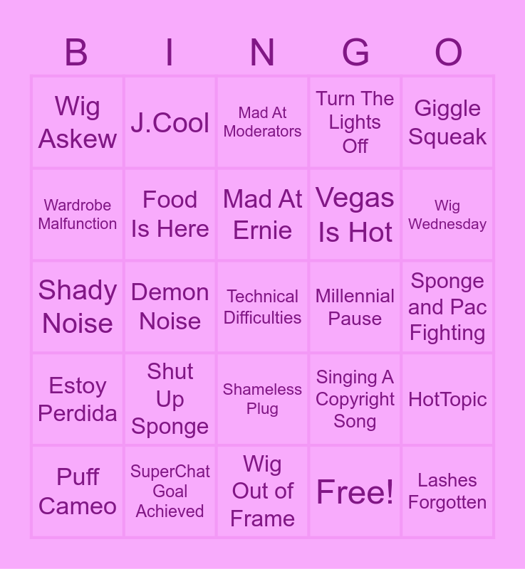 This bingo card has 32 words: Free!, Chat Ignored, Demon Noise, Encouraging Crime, Estoy Perdida, Food Is Here, Giggle Squeak, HotTopic, J.Cool, Lashes Forgotten, Mad At Ernie, Mad At Moderators, Mad At PAC, Mad At Wiglets, Millennial Pause, Okay Grandma Stories, Puff Cameo, Shady Noise, Shameless Plug, Shut Up Sponge, Singing A Copyright Song, Someone Famous In Chat, Sponge and Pac Fighting, SuperChat Goal Achieved, Technical Difficulties, Turn The Lights Off, Vegas Is Hot, Wardrobe Malfunction, Wig Askew, Wig Out of Frame, Wig Too Big in Frame and Wig Wednesday.