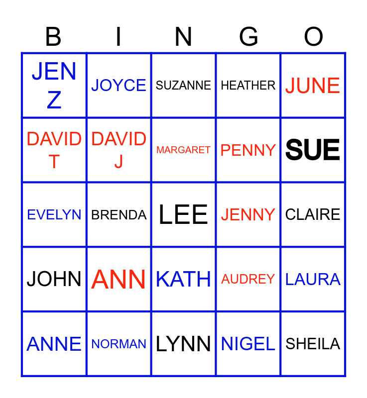 This bingo card has a free space and 24 words: ANN, NORMAN, MARGARET, ANNE, JUNE, JEN Z, DAVID T, JOYCE, JENNY, KATH, PENNY, EVELYN, AUDREY, LAURA, DAVID J, NIGEL, CLAIRE, SUZANNE, SUE, BRENDA, SHEILA, JOHN, HEATHER and LYNN.