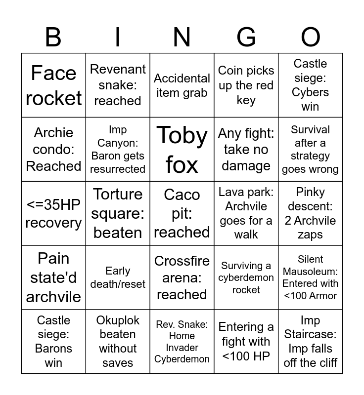 This bingo card has 25 words: Early death/reset, Rev. Snake: Home Invader Cyberdemon, Toby fox, Castle siege: Barons win, Castle siege: Cybers win, Face rocket, Archie condo: Reached, Revenant snake: reached, Lava park: Archvile goes for a walk, Crossfire arena: reached, Any fight: take no damage, <=35HP recovery, Surviving a cyberdemon rocket, Silent Mausoleum: Entered with <100 Armor, Imp Canyon: Baron gets resurrected, Imp Staircase: Imp falls off the cliff, Pinky descent: 2 Archvile zaps, Accidental item grab, Survival after a strategy goes wrong, Torture square: beaten, Caco pit: reached, Okuplok beaten without saves, Pain state'd archvile, Coin picks up the red key and Entering a fight with <100 HP.
