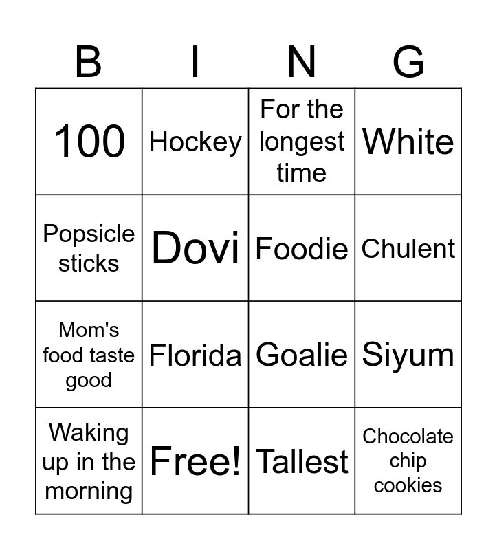This bingo card has 21 words: Free!, BEARS, Hockey, Shmoopi, Tallest, Foodie, 100, For the longest time, Goalie, Chulent, Mom's food taste good, White, Chocolate chip cookies, Daniel, Dovi, Scream, Waking up in the morning, Florida, Popsicle sticks, Siyum and Redo's.