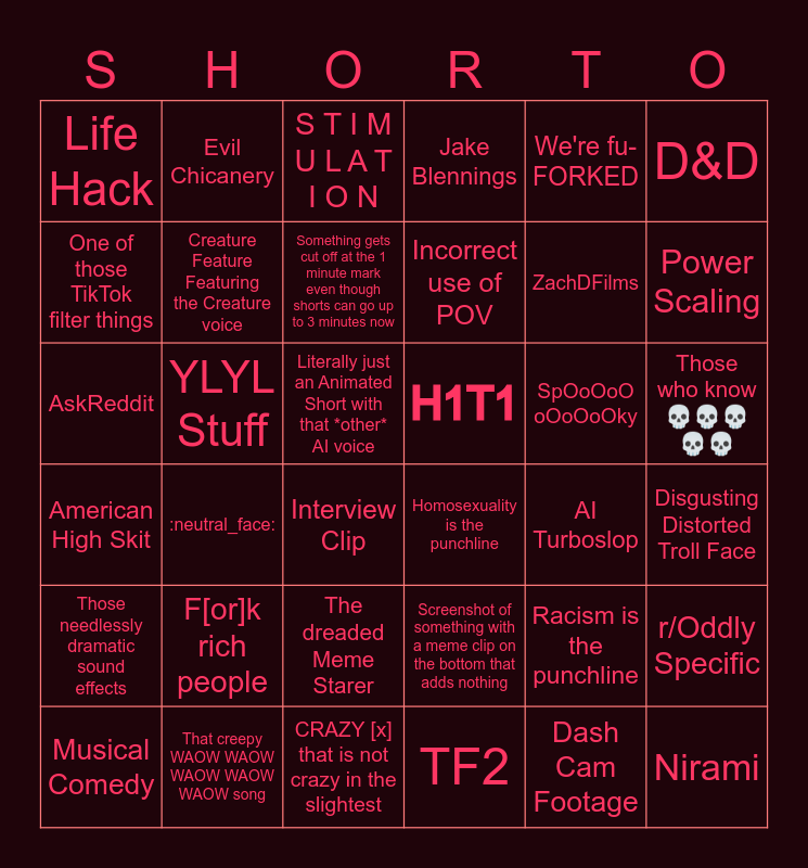 This bingo card has 83 words: Word that has it's own Subtitle, Joe Rogan, S T I M U L A T I O N, Dumb excuse to Loop, Dropout, Cooking, Aliens trying to understand the human concept of "Comedy", Short with under 10k views, Nirami, Caseoh, Top 5 X, Skit that is not accurate in the slightest, One of those TikTok filter things, YLYL Stuff, QUICK! CALL JJJACKSFILMS!, Life Hack, Interview Clip, D&D, Free!, That creepy WAOW WAOW WAOW WAOW WAOW song, Dash Cam Footage, Something gets cut off at the 1 minute mark even though shorts can go up to 3 minutes now, AskReddit, AI PFP, Power Scaling, Borderline Cornography, Memes plundered from [INSERT SOCIAL MEDIA HERE], Part of a Comedy Special, Phonk, Genuinely good loop, SpOoOoO oOoOoOky, Sambucha, CRAZY [x] that is not crazy in the slightest, ZachDFilms, Those needlessly dramatic sound effects, The dreaded Meme Starer, AI Turboslop, Organic Human Made non-content farm Slop, Incorrect use of POV, H1T1, r/Oddly Specific, TF2, "What did I just watch" in a "I fully understand what I just watched but refuse to accept it" way, "What did I just watch" in a "No actually can you say that again?" way, Comically Bizarre "Satisfying" background clip, Genuinely Amazing Content, Evil Chicanery, Would you Rather, "Skull Emoji" -Matt Rose, Those fake Text conversations (Like with Amir!), American High Skit, Jake Blennings, Literally just an Animated Short with that *other* AI voice, BTS stuff, Little Sponge and Suburu, [NAME] and [NAME] skits, Musical Comedy, Cookin' in the Pines, Homosexuality is the punchline, Eco Friendly Wood Veneers, Actually good voice acting, The TikTok girl voice, Tumblr, We're fu- FORKED, Yeesh I feel bad now, :neutral_face:, Rectangle video in the middle, black top and bottom, Racism is the punchline, Huh, neat., Green Screen, Likely AI generated story, AI Sad Story, Anti-Climactic, Those who know💀💀💀💀💀, Disgusting Distorted Troll Face, Really Bad Video Quality, Okay uhhhh pretty sure that is illegal, Creature Feature Featuring the Creature voice, Screenshot of something with a meme clip on the bottom that adds nothing, F[or]k rich people, "Bro", "Crying Laughing Emoji" and Unnecessarily Epic Music.